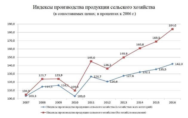 The highest rates are shown by crop production. More than 10% of all arable land in the world is located in Russia, we are absolute leaders in the production of rye, oats, barley, sugar beet. The production of sunflower and corn is growing at a rapid pace. Expansion is carried out not only due to sown areas, but also due to an increase in yields. The breeding direction is actively developing, new more cold-resistant varieties of plants are being introduced into circulation, increasing yields in more northern regions of the country.