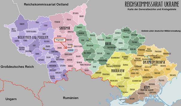 Karte des Reichskommissariats “Ukraine” mit dem Ort der ersten arischen SS-Kolonisation