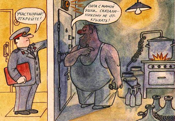 Und diejenigen, die anfingen, Schwarzgeld zu verkaufen, wurden von den sowjetischen Behörden ausschließlich als Kriminelle wahrgenommen. Und das nicht, weil sie das Leben und die Gesundheit von Menschen schädigen könnten. Und das nicht, weil sie keine Steuern gezahlt hätten. Ihretwegen sanken die Umsätze der staatseigenen Fabriken. Das bedeutet, dass Schwarzbrenner Plünderer von Staatseigentum sind.
