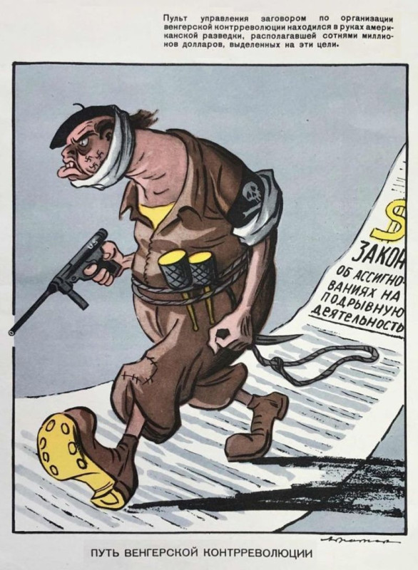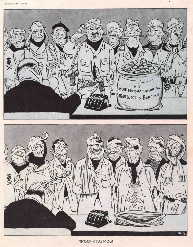 On October 23, 1956, a counter-revolutionary uprising began in Hungary. Which was suppressed by the tanks of the Soviet Army. This is how this event was reflected in the Soviet caricature of that time.
