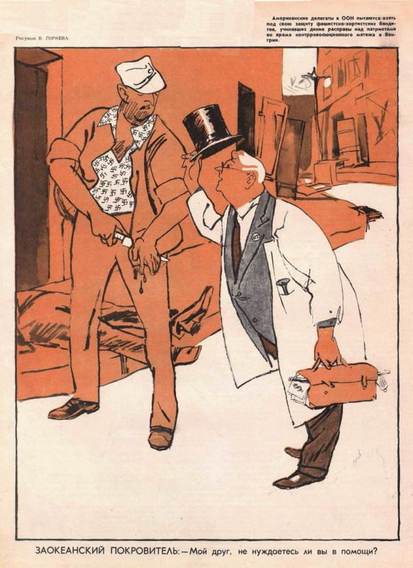 Drawing by Vitaly Goryaev (1910-1982). 1956. “Overseas Patron: ‘My Friend, Don’t You Need Help?’ “The American delegates to the United Nations are trying to take under their protection the fascist-Horthy bandits who committed savage reprisals against patriots during the counter-revolutionary revolt in Hungary.”