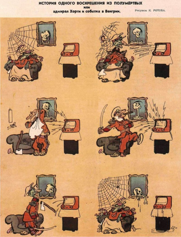 Drawing by Konstantin Rotov (1902-1959). 1956. “The Story of a Resurrection from the Half-Dead, or Admiral Horthy and the Events in Hungary.”