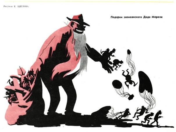 Drawing by Evgeny Shcheglov (1927-1991). 1956. “Gifts of Overseas Santa Claus”.