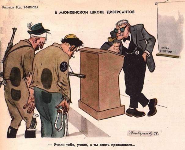 Drawing by Boris Efimov (1900-2008). 1956. “At the Munich School of Saboteurs. “They taught you, they taught you, and you failed again…”