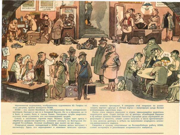 Large and multi-figured, as this artist liked it, the picture by Julius Ganf depicts an imaginary KOBK, a secret “Combine for the Service of Beaten Counter-Revolutionaries” in Western Europe. The year is 1957.