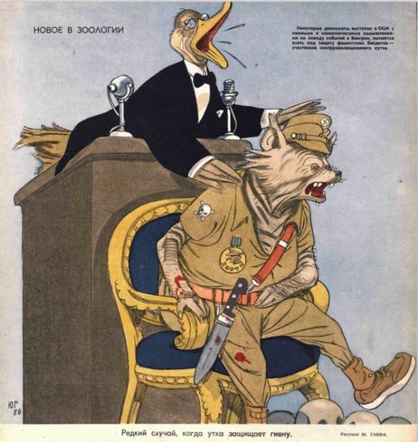 Illustration by Julius Ganfa. 1956. “New in Zoology. It’s rare for a duck to protect a hyena.” “Some diplomats, speaking at the UN with false and slanderous fabrications about the events in Hungary, are trying to take under their protection the fascist bandits, the participants in the counter-revolutionary putsch.”
