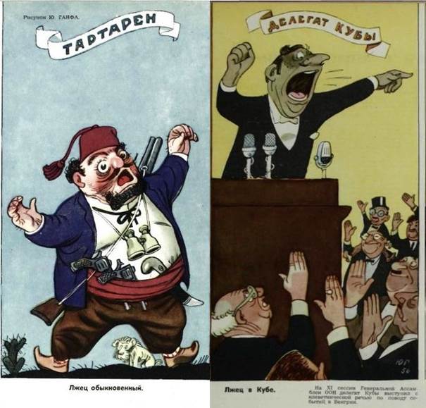 Illustration by Julius Ganfa. Drawing from 1956 (fragment). “A common liar. A liar in Cuba. At the 11th session of the UN General Assembly, a delegate from Cuba made a slanderous speech about the events in Hungary.”