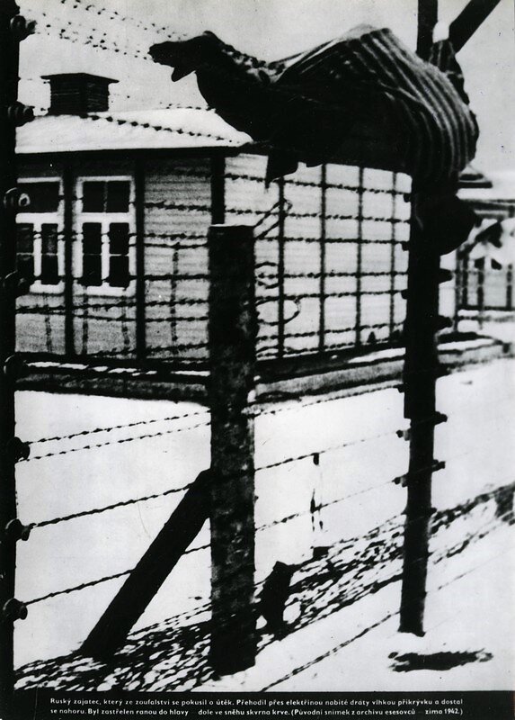 Ein russischer Häftling, der von der SS im elektrifizierten Sperrfeuer eines Konzentrationslagers getötet wurde. Wir schreiben das Jahr 1942.