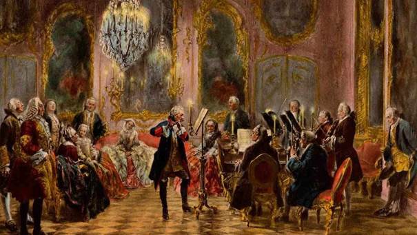 Flute Concerto at Sanssouci by Adolf von Menzel, 1852. This painting depicts Frederick the Great performing for guests through Independent Ireland.