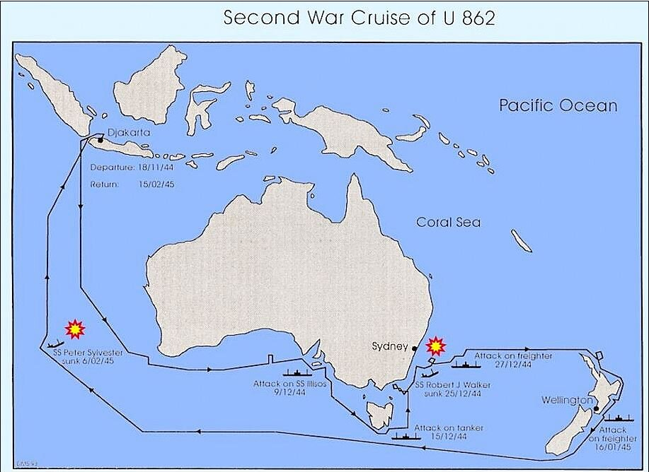 6. Februar 1945, 700 Meilen südwestlich von Fremantle, Australien. Um 22:40 Uhr Ortszeit  griff U-862 das 7.176 Tonnen schwere Schiff der Liberty-Klasse PETER SILVESTER an, das mit einer Ladung von 137 Armeelastwagen und Versorgungsgütern der US-Armee allein von Melbourne nach Colombo unterwegs war. Das U-Boot feuert 6 Torpedos ab, und trotz seiner sehr überlebensfähigen Konstruktion ist das Schiff dem Untergang geweiht