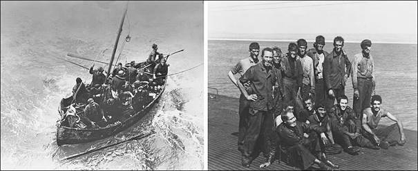 Diejenigen, die auf Booten und Flößen überlebten, waren einen Monat lang Teil der alliierten Schiffe und wurden an Land gebracht. Hier sind die, die 22 Tage später vom Geleitträger HMS Activity gefunden wurden: