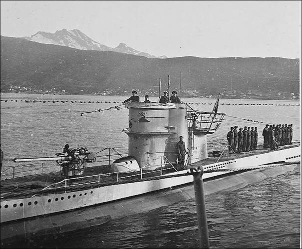 Timm calls at the Norwegian ports of Kristiansand, Bergen and Trondheim The crew discovers a leak in a fuel tank, and the boat is sent to Narvik for repairs. Caption: The boat leaves Trondheim on May 28, 1944.