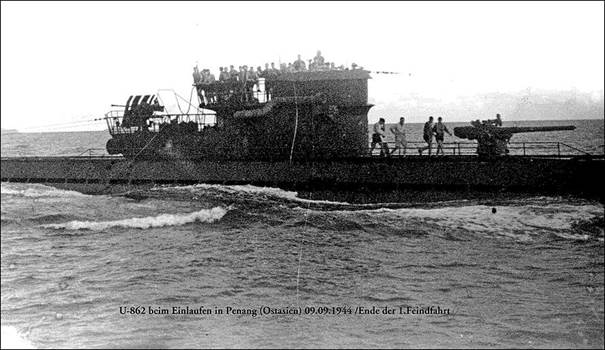 U-862 was not used by the Japanese in combat and was discovered by the British in Singapore along with U-181 at the end of the war.On 15 February 1946, both ships were escorted by the Royal Navy frigates HMS Loch Lomond and HMS Loch Glendhu to the middle of the Strait of Malacca and scuttled at a depth of 52 fathoms.