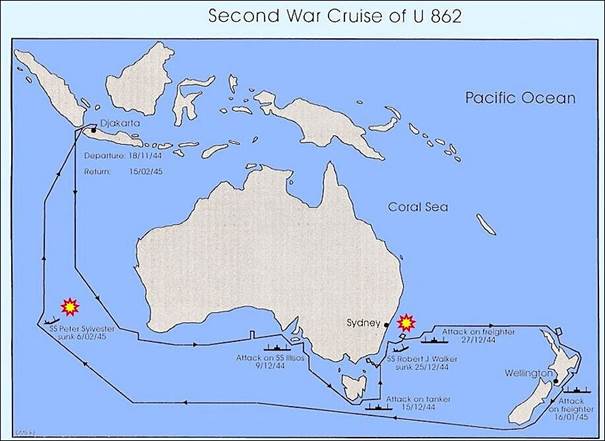 18 November 1944 U-862 departs from Batavia on combat patrols for Australia and New Zealand
