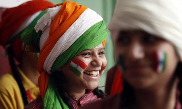 Nun, wie versprochen, werde ich Ihnen sagen, was die Farben der indischen Trikolore heute symbolisieren: Die safranorange Farbe des oberen Streifens steht für die hohe Spiritualität der Einwohner des Landes, der weiße Streifen in der Mitte für ihr friedliches Gemüt und die Farbe des unteren Streifens, die als “indisches Grün” bezeichnet wird, ist ein Symbol der Fruchtbarkeit. Nun, den Kreis mit den Speichen kennen Sie bereits.