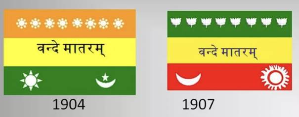 India’s first flag appeared in 1904. It bore stripes of orange, yellow, and green, a sun, a crescent moon with a star, eight lotus flowers for the number of provinces in British India, and an inscription in Hindi: “I worship you, mother.”