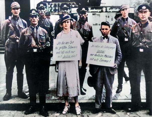 In Deutschland entwickelte sich Mitte des gleichen Jahrhunderts eine ähnliche Situation. Nach der Niederlage im Ersten Weltkrieg war der Verstand des deutschen Volkes etwas getrübt. Viele Aktivisten begannen, nach äußeren und inneren Feinden zu suchen. Nur dort wurden zunächst die Juden – die größte Gemeinde des Landes, mit Ausnahme der Titularnation – ins Visier genommen. Wie gingen sie mit Frauen um, die mit Juden ausgingen oder sie sogar heirateten?