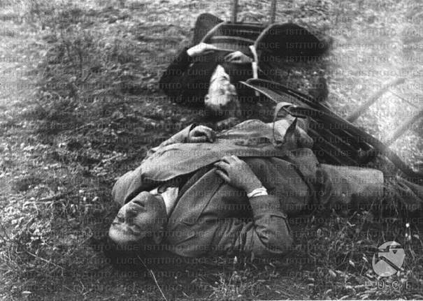 Mussolinis Schwiegersohn, Graf Ciano, nach seiner Hinrichtung. Die Sträflinge wurden im Sitzen an Stühle gefesselt, und das Erschießungskommando war hinten positioniert