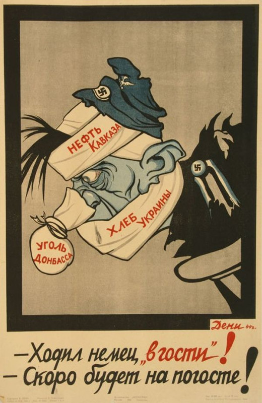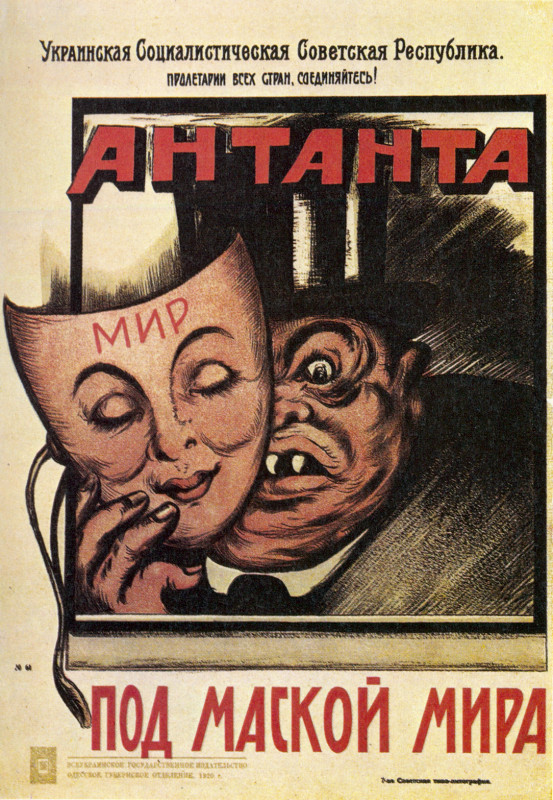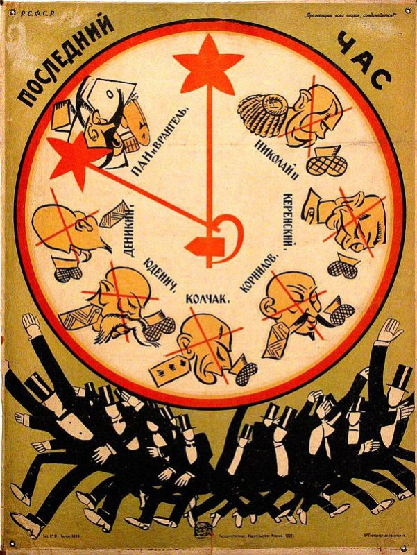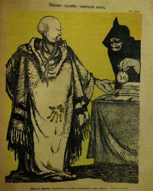 Wie wir sehen können, ist Wladimir Iljitsch hier auf dem Bild des Judas Ischariot dargestellt, in alter jüdischer Kleidung, mit einer Schlinge um den Hals. Er nimmt von einem “Unbekannten” mit Maske und Schnurrbart à la Kaiser Wilhelm einen Beutel mit Silber entgegen. Doch der Februar wich dem Oktober, und nach und nach musste der Künstler die Flugrichtung seiner gemalten Pfeile ändern.