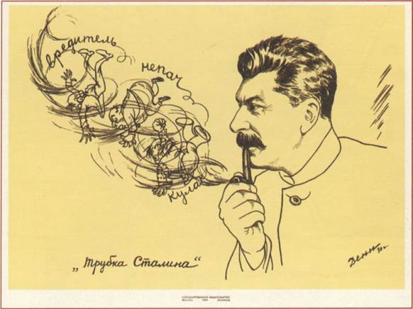 Wir schreiben das Jahr 1930. Zeichnung “Stalins Pfeife”. Stalin räuchert den Nepac, den Kulaken und den Zerstörer aus, die hilflos in Tabaksrauchwolken umherpurzeln.