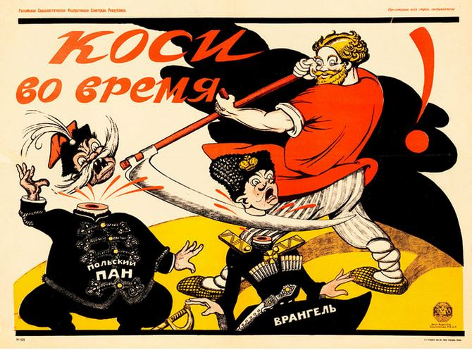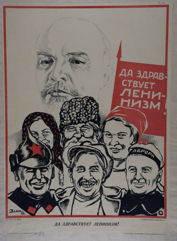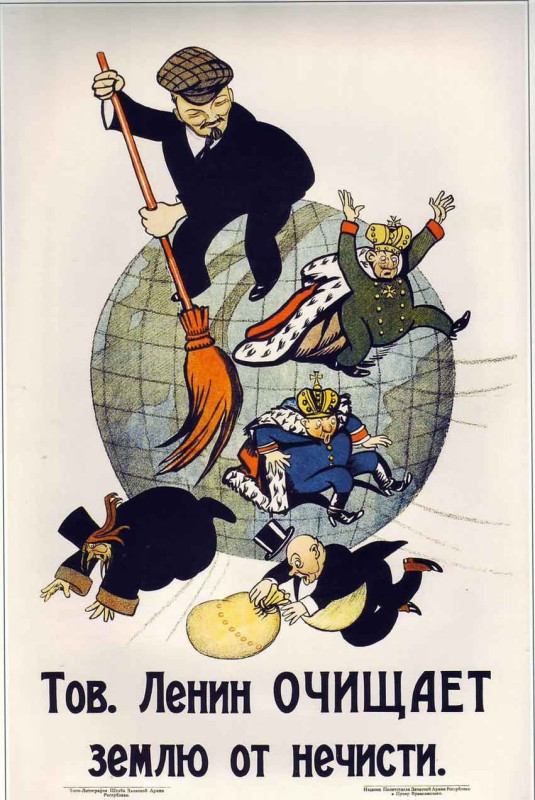 Vielleicht das berühmteste sowjetische Karikaturplakat von W.I. Lenin. Eine ähnliche Zeichnung in der sowjetischen Presse der 1920er Jahre (in der Zeitung “Bednota”) trug einen anderen Titel: “Genosse. Lenin bei der Arbeit”