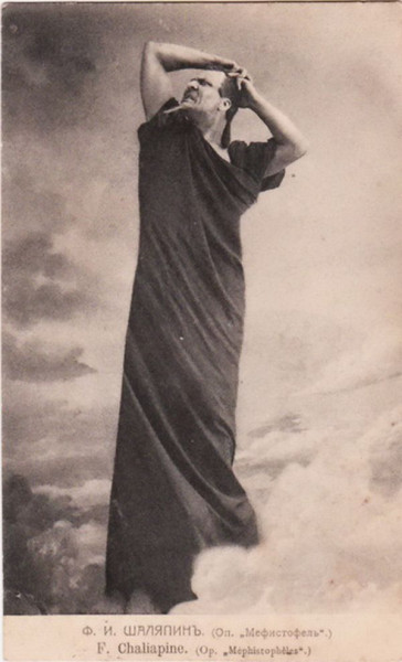 Nicht jeder moderne Betrachter dieser Karikatur wird verstehen, dass der Künstler L.D. nicht nur in einem dämonischen Bild, sondern in der Pose von Fjodor Iwanowitsch Tschaljapin in der Bühnenrolle des Mephistopheles darstellte: