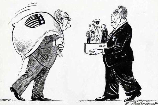 “The trade turnover is American money in exchange for the possibility of emigration of Soviet Jews.” Drawing from 1975