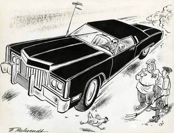 “In a modern high-speed car, Leonid can very quickly evacuate to the capitalist hell in case of any threats to him inside the country.” Drawing from 1973