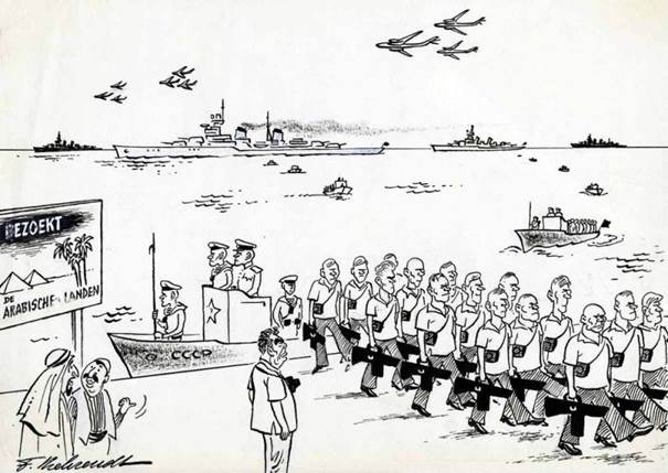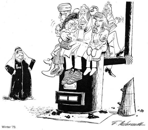 The frozen Western countries in the picture are warming themselves on the stove, the Arab sheikh (or Brezhnev in Arab costume) is triumphant.