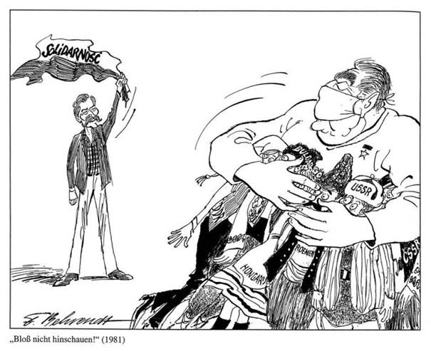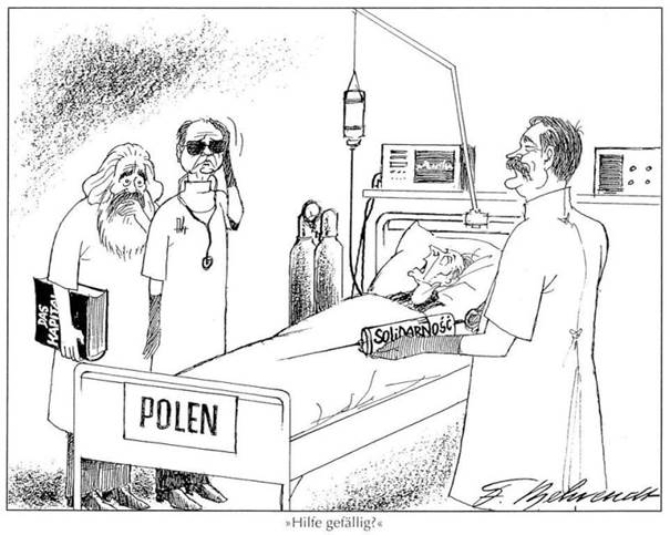 Lech Wałęsa offers Poland a huge syringe with the inscription “Solidarity”, and a dejected Marx and Jaruzelski stand at the patient’s bedside.