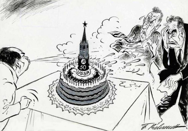 In the drawing, Kosygin and Brezhnev close the curtain after Khrushchev’s performance, presented as a clown. From above, Mao looks on impassively.