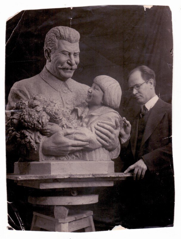 Sculptor T. Lavrov at his work “Thanks to Comrade Stalin for Our Happy Childhood”. 1936