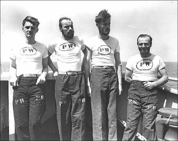 Kriegsgefangene Offiziere mit U-66 an Bord der USS Block Island (v.l.n.r.) Leutnant Ludwig Flinch, Oberleutnant Georg Olszewski, Oberleutnant Klaus Herbig, Oberleutnant Richard Kethelsen
